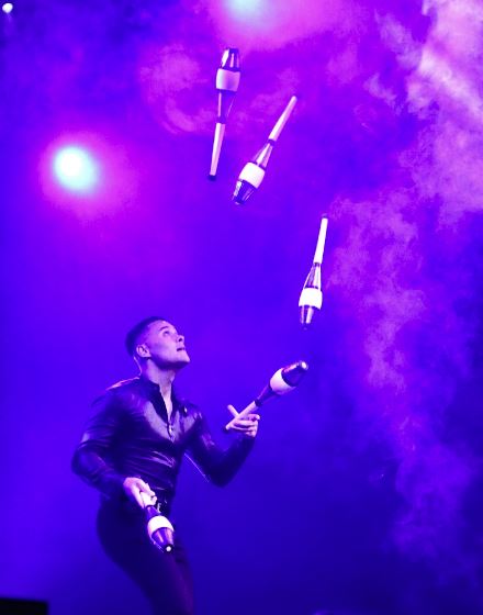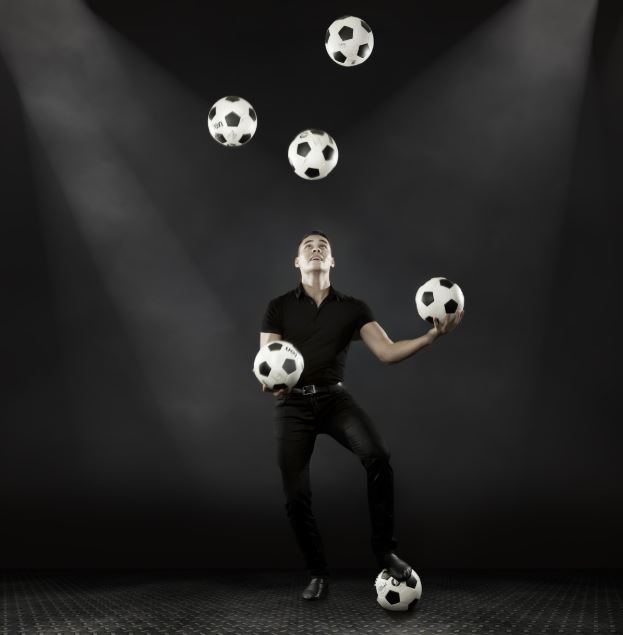 Wat Messi met een bal doet heeft deze talentvolle jongleur met 3 ballen onder de knie. Op het veld of in de skybox, ook langs de zijlijn kan het publiek meegenieten.