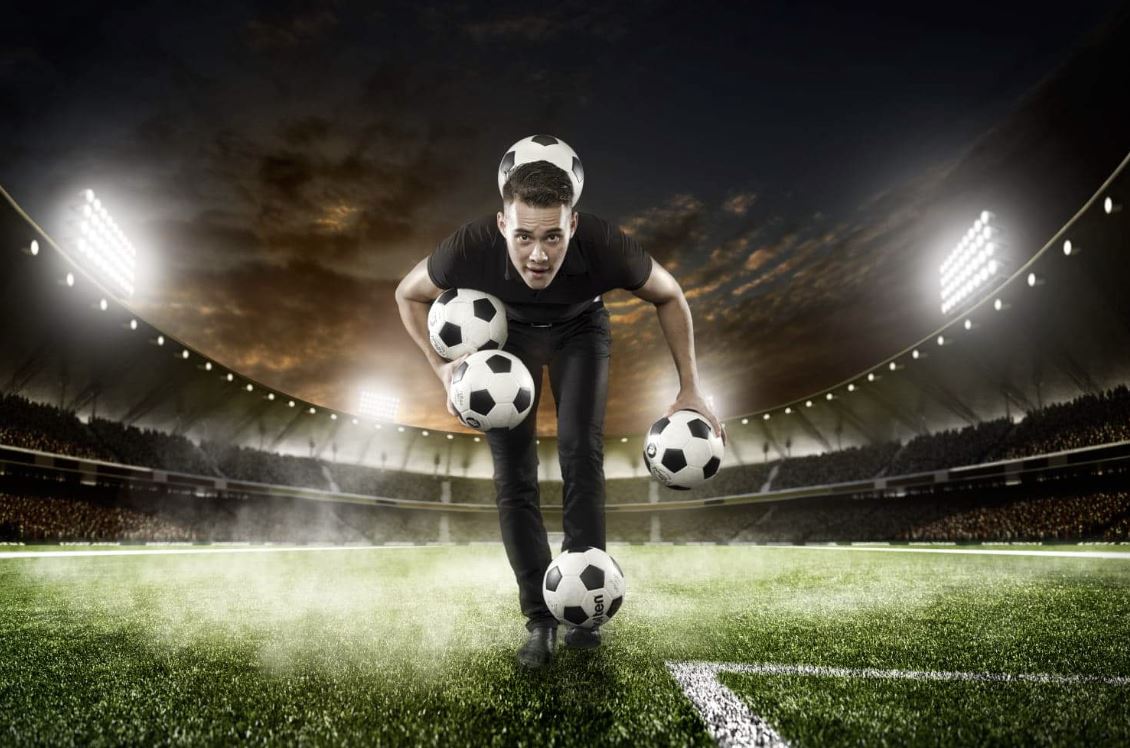 Jongleur Nigel heeft de trucs letterlijk onder de knie. Wat normale voetballers met hun voeten doen, doet Nigel met zijn handen. In een razend tempo vliegen tot 5 voetballen door de lucht.